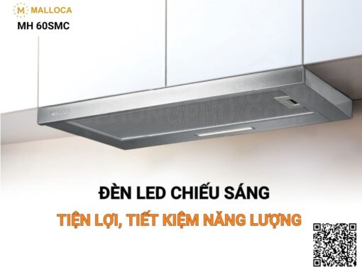 Ngay mặt dưới máy hút mùi Malloca MH 60SMC còn tích hợp đèn LED thanh 4W chiếu sáng rất tiết kiệm điện. Đèn LED cung cấp ánh sáng trực tiếp xuống khu vực bếp nấu phía dưới, giúp bạn dễ dàng quan sát khi nấu nướng, nhất là trong điều kiện thiếu sáng. Với lượng ánh sáng vừa đủ, không quá chói cũng không bị tối, bạn có thể sử dụng để nấu ăn vào ban đêm mà không cần phải bật điện cho cả nhà bếp. Vừa tiện lợi lại tiết kiệm điện năng cho gia đình.