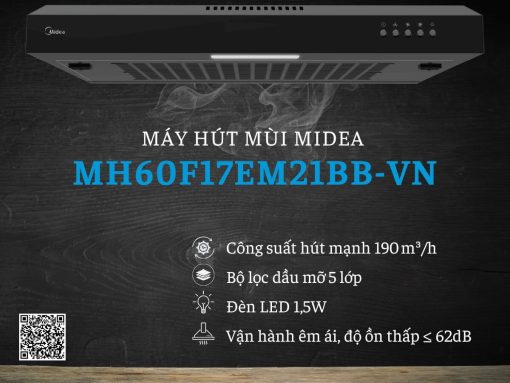Máy hút mùi Midea MH60F17EM21BB-VN thiết kế mỏng gọn, hiện đại, phù hợp với bếp nhỏ và căn hộ chung cư. Máy có lực hút mạnh 190 m³/h, bộ lọc nhôm 5 lớp dễ tháo rời, đèn LED chiếu sáng tiện lợi và ba tốc độ quạt linh hoạt, giúp loại bỏ mùi, dầu mỡ và hơi nước hiệu quả, đồng thời dễ dàng vệ sinh và tiết kiệm không gian bếp.