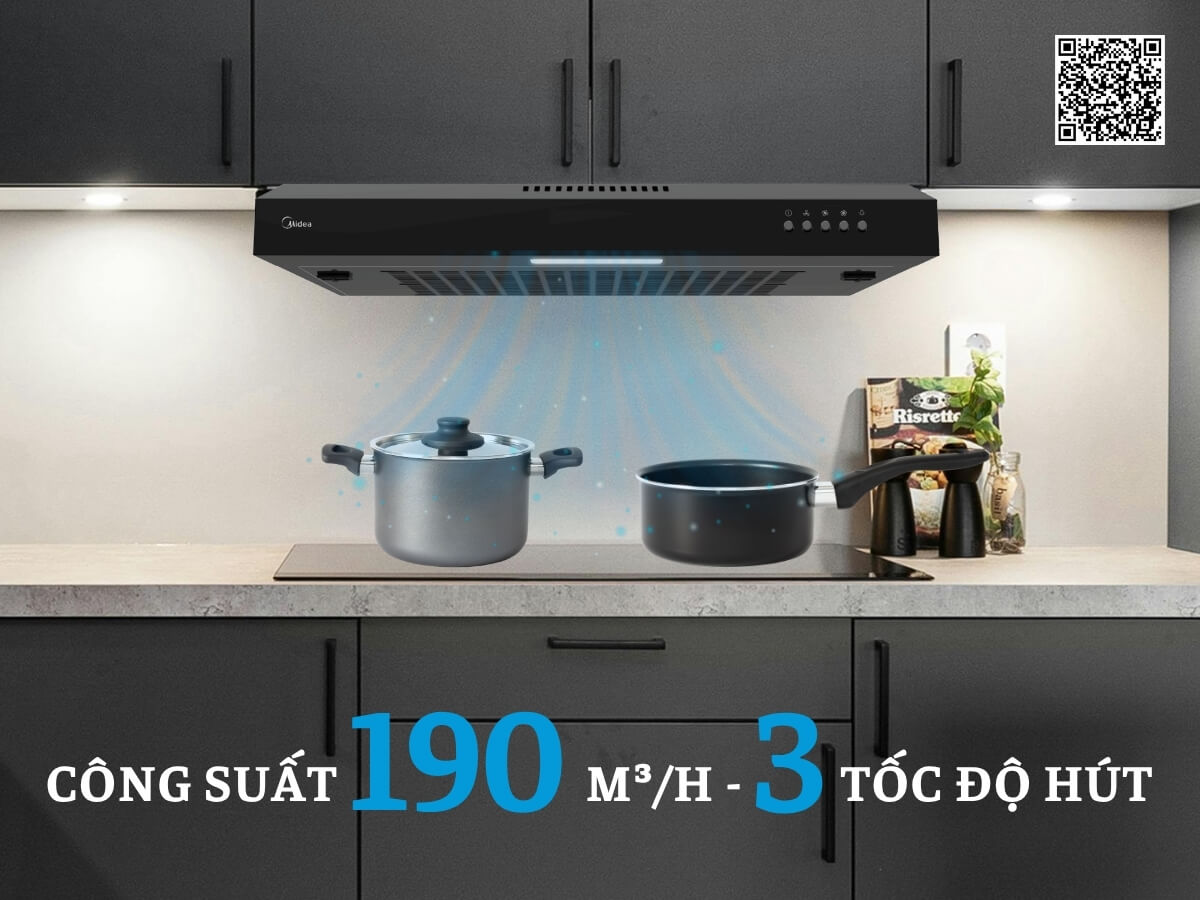 Công suất hút mạnh mẽ 190 m³/h với 3 tốc độ quạt hút, loại bỏ mùi hiệu quả