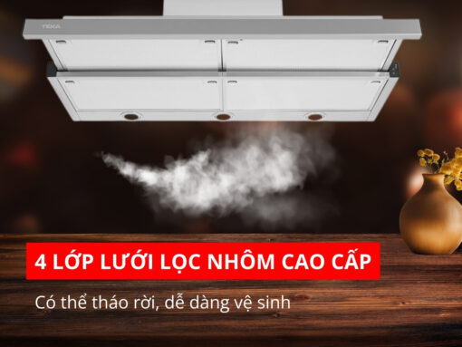 Máy hút mùi Teka CNL 9610 được trang bị hệ thống 4 lớp lưới lọc bằng nhôm cao cấp, có khả năng giữ lại dầu mỡ, bụi bẩn và các hạt nhỏ sinh ra trong quá trình nấu nướng. Thiết kế nhiều lớp giúp tối ưu hiệu quả lọc, đồng thời bảo vệ động cơ bên trong luôn sạch sẽ và hoạt động ổn định.