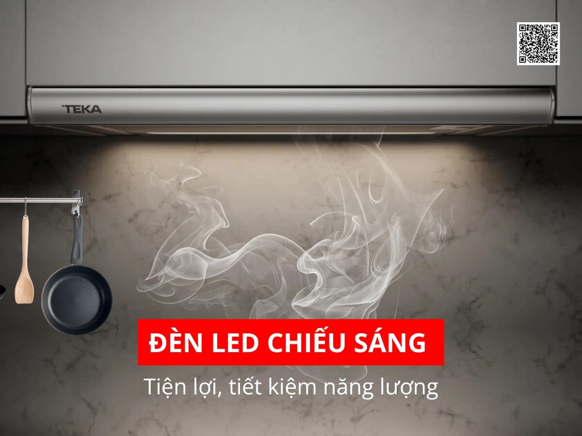 Máy hút mùi Teka TL 6310 tích hợp 2 LED chiếu sáng giúp chiếu sáng trực tiếp khu vực nấu nướng, mang lại sự tiện lợi tối đa cho người sử dụng. Ánh sáng LED vừa rõ nét vừa tiết kiệm năng lượng, đồng thời có tuổi thọ cao, đảm bảo bếp luôn sáng và thuận tiện trong quá trình chế biến món ăn. Thiết kế này không chỉ hỗ trợ nấu nướng hiệu quả mà còn tăng tính thẩm mỹ cho không gian bếp.