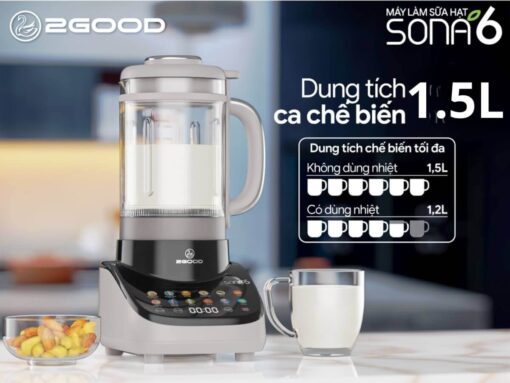 Máy làm sữa hạt 2GOOD Sona 6 trang bị menu nấu đa dạng với 12 chức năng tự động cài sẵn, không chỉ làm sữa hạt mà còn có thể nấu cháo, súp, nấu đồ ăn cho trẻ em… đáp ứng nhu cầu cho cả gia đình. Cối xay dung tích lớn 1.5 lít, chất liệu thuỷ tinh chịu nhiệt, an toàn, đặc biệt là có thêm lớp vỏ nhựa bên ngoài cách nhiệt và chống bỏng, tạo trải nghiệm tốt nhất cho người dùng.