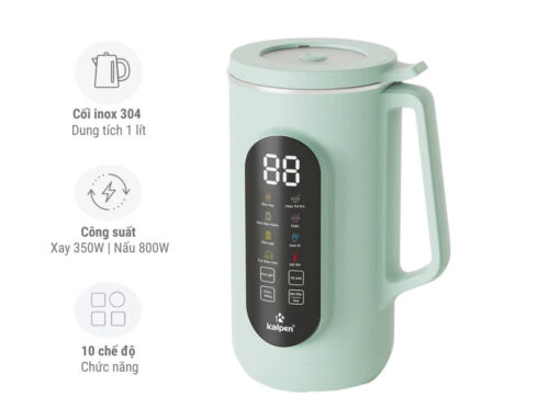 Máy làm sữa hạt Kalpen H6 thiết kế thời trang với gam màu xanh mint đẹp mắt, bảng điều khiển cảm ứng tiếng Việt hiện đai, dễ sử dụng. Dung tích cối 1 lít phù hợp sử dụng cho gia đình 2-4 người. Công suất xay 350W, nấu 800W kết hợp lưỡi dao 3 tầng 10 cánh sắc bén, giúp xay khoẻ nấu nhanh, mang đến những ly sữa hạt thơm ngon sánh mịn. Lòng cối và lưỡi dao chất liệu inox 304 chống gỉ, đảm bảo an toàn sức khoẻ và dễ vệ sinh, làm sạch. Ngoài nấu sữa hạt, bạn còn có thể nấu cháo, hầm, xay sinh tố… đa dạng món ngon cho gia đình.