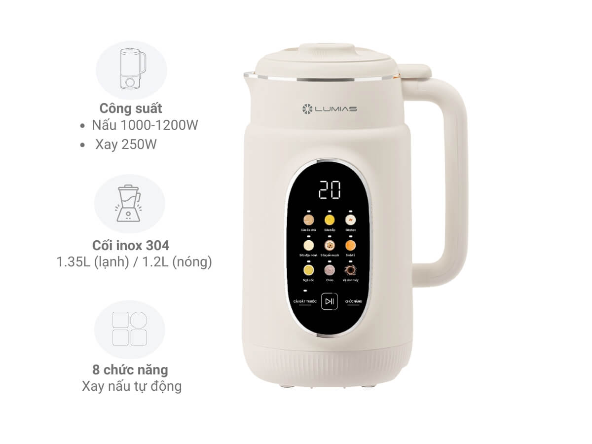 Máy làm sữa hạt Lumias M135W thiết kế nhỏ gọn, hiện đại với gam màu Trắng/Be thanh lịch, bảng điều khiển cảm ứng với màn hình LED dễ sử dụng. Máy có dung tích 1.35L cho đồ uống lạnh và 1.2L cho đồ uống nóng, phù hợp sử dụng cho gia đình. Với công suất nấu mạnh mẽ 1000-1200W, công suất xay 250W và 8 chế độ cài đặt sẵn, máy giúp bạn dễ dàng chế biến những ly sữa hạt sánh mịn, thơm ngon hay nhiều món ăn bổ dưỡng khác. Ruột bình và lưỡi dao 4 cạnh 3 lớp bằng chất liệu inox 304 cao cấp, đảm bảo an toàn cho sức khỏe.