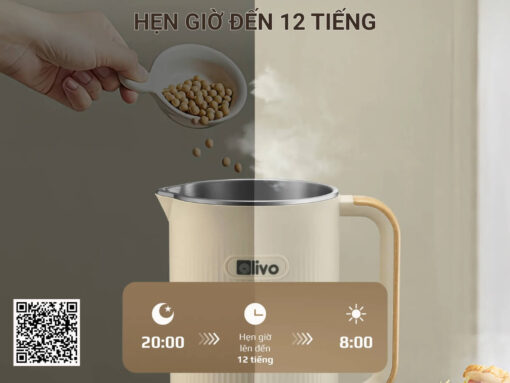 Máy làm sữa hạt Olivo CB1200 còn được tích hợp tính năng hẹn giờ đến 12 tiếng, thuận tiện để chế biến bữa ăn sáng, bạn chỉ cần chuẩn bị nguyên liệu và cho vào cối vào buổi tối, cài đặt hẹn giờ và sáng hôm sau khi thức dậy, bạn sẽ có ngay món cháo, món sữa hạt thơm ngon để thưởng thức mà không cần dậy sớm.