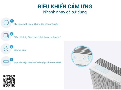 Máy lọc không khí Coway AP-1019C(W) sử dụng bảng điều khiển cảm ứng hiện đại đặt trên đỉnh thiết bị. Bạn có thể dễ dàng bật/tắt máy, điều chỉnh các chế độ lọc, tốc độ quạt, đèn báo, hoặc kiểm tra thời gian cần thay màng lọc chỉ cần một thao tác chạm nhẹ.