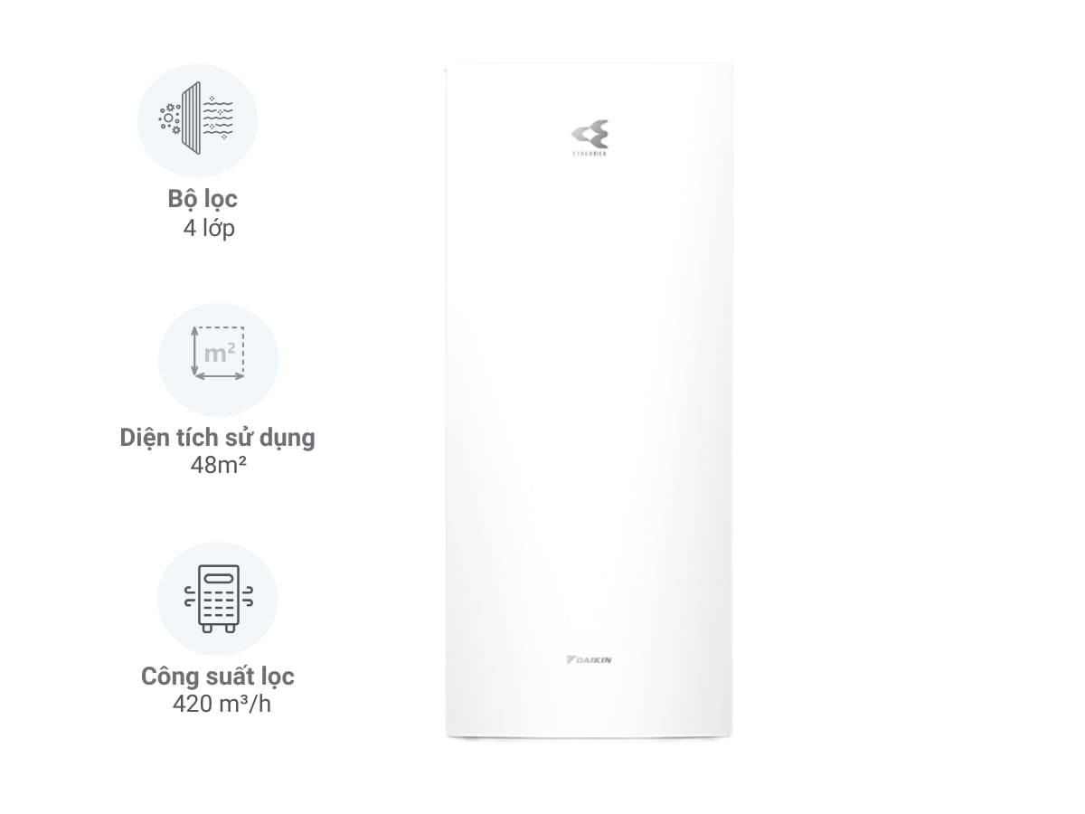 Máy lọc không khí Daikin MCK70ZVM7-W trang bị hệ thống lọc tiên tiến kết hợp công nghệ Twin Streamer và Ion Plasma, không chỉ lọc sạch bụi bẩn mà còn khử mùi, diệt khuẩn và tạo ẩm hiệu quả. Công suất hoạt động mạnh mẽ 82W, tốc độ lọc không khí 420 m³/h và diện tích làm sạch đến 48m². Máy có nhiều chế độ hoạt động thông minh, 4 mức cài đặt tốc độ lọc giúp bạn dễ dàng tuỳ chỉnh theo nhu cầu. Ngoài ra còn có hệ thống cảm biến bụi mịn PM2.5, mùi, độ ẩm, nhiệt độ giúp tối ưu hiệu quả lọc khí, và đèn báo chất lượng không khí giúp bạn dễ dàng theo dõi tình trạng không khí trong phòng. Hệ thống điều khiển nút nhấn điện tử hiện đại, dễ sử dụng.