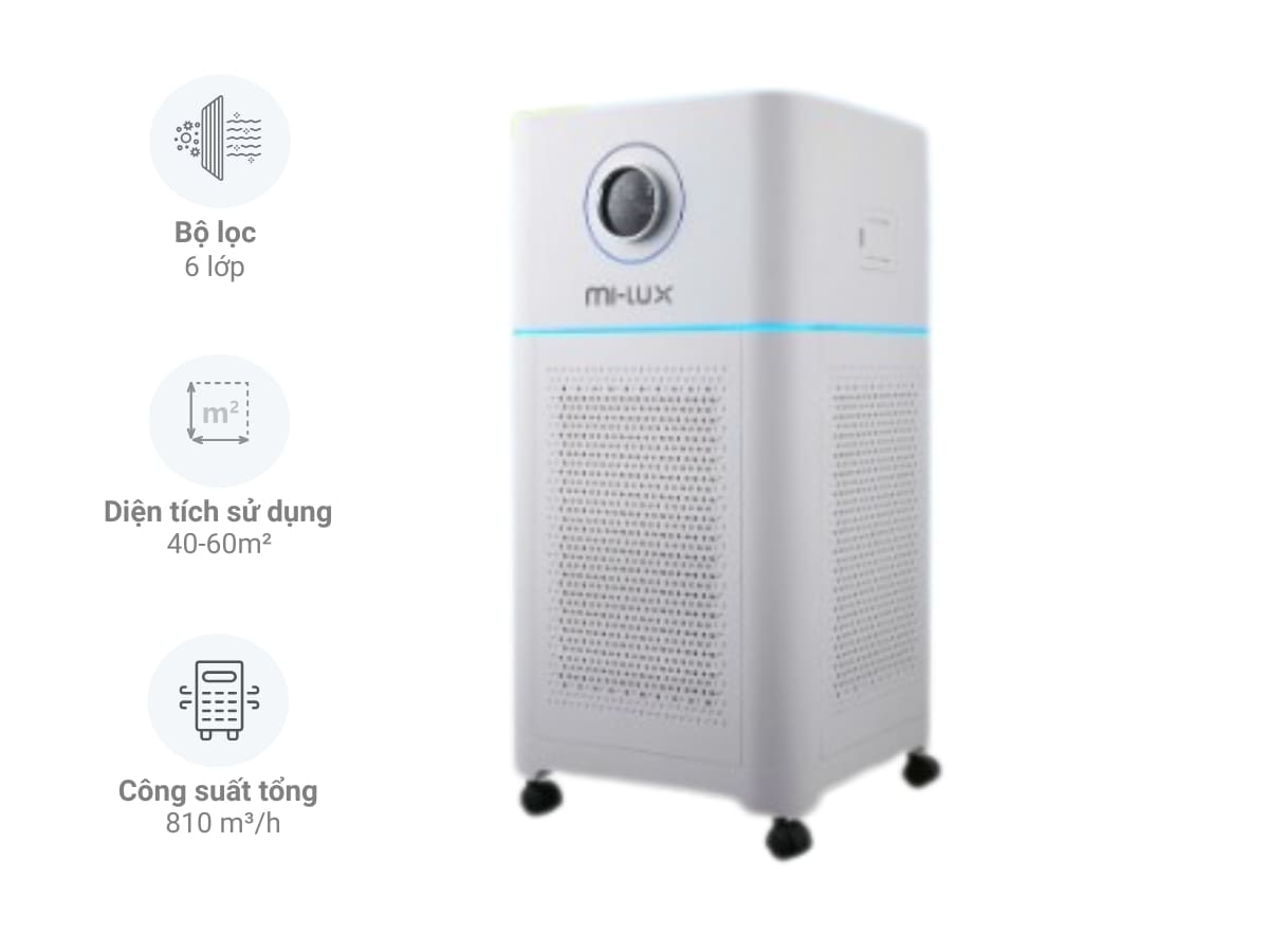 Máy lọc không khí và bù ẩm Mi-lux AH100 PRO có phạm vi lọc tối ưu lên đến 60m² (hỗ trợ tối đa 80m²), máy trang bị bộ lọc 6 lớp chuyên sâu, không chỉ lọc sạch bụi bẩn mà còn khử mùi, bù ẩm hiệu quả, đặc biệt còn có công nghệ diệt khuẩn bằng ion âm (3 triệu/cm³) và tia UV, cung cấp giải pháp toàn diện để bảo vệ sức khoẻ cho cả gia đình.