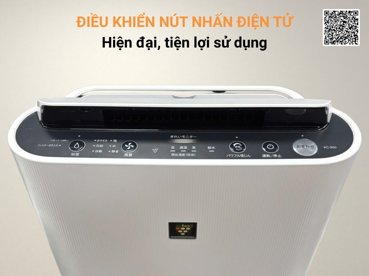 Máy lọc không khí và tạo ẩm Sharp KC-S50-W thiết kế bảng điều khiển nút nhấn điện tử hiện đại, giúp điều khiển và sử dụng máy dễ dàng, tiện lợi.
