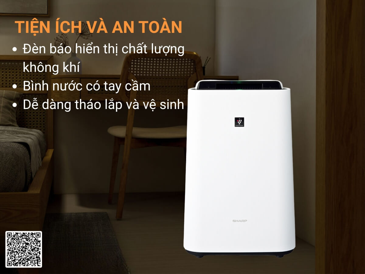 Máy lọc không khí và tạo ẩm Sharp KC-S50-W được trang bị hệ thống cảm biến thông minh bao gồm cảm biến bụi, bụi mịn PM2.5, nhiệt độ và độ ẩm. Các cảm biến này giúp máy tự động nhận diện mức độ ô nhiễm và độ khô trong không khí, từ đó điều chỉnh chế độ hoạt động một cách tối ưu để lọc sạch không khí và bù ẩm hiệu quả, mang lại không gian sống trong lành nhất cho gia đình bạn.