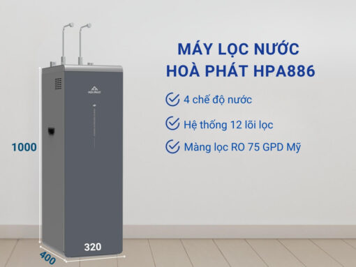 Máy lọc nước Hoà Phát HPA886 trang bị 4 chế độ nước nóng – lạnh – tinh khiết – hydrogen ion kiềm, cung cấp sự tiện dụng tối đa cho người dùng, đặc biệt là nước Hydrogen mang đến nhiều lợi ích cho sức khoẻ. Công nghệ làm lạnh Block giúp làm lạnh nhanh và sâu, cho nước mát lạnh giải khát mùa hè. Máy ứng dụng công nghệ lọc RO với hệ thống 12 lõi lọc, màng lọc RO 75 GPD Mỹ giúp lọc sạch nước, loại bỏ vi khuẩn, mùi và chất có hại trong nước, mang đến nguồn nước hoàn toàn sạch sẽ, an toàn.