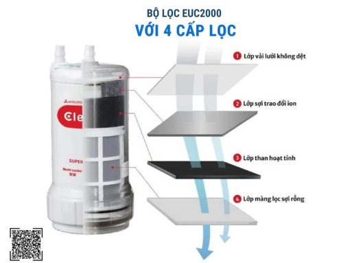 Máy lọc nước ion kiềm Mitsubishi Cleansui EU301 ứng dụng công nghệ màng lọc sợi rỗng với bộ lọc EUC2000 gồm 4 cấp lọc:
