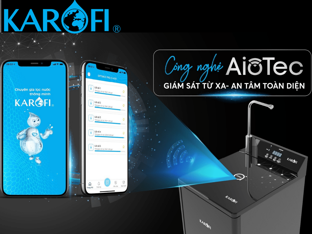 Máy lọc nước Karofi KAD-D88 có điểm điểm sáng đáng chú ý là tích hợp công nghệ AiOTec thông minh. Công nghệ này cho phép giám sát máy lọc nước từ xa trên chính thiết bị di động của bạn. Các tính năng bao gồm: quản lý tình trạng của máy, xác thực hàng chính hãng, cảnh báo thay lõi, hiển thị độ sạch của nước, gửi yêu cầu bảo hành… Với AiOTec, bạn có thể yên tâm giám sát máy từ bất cứ đâu và bất cứ lúc nào.
