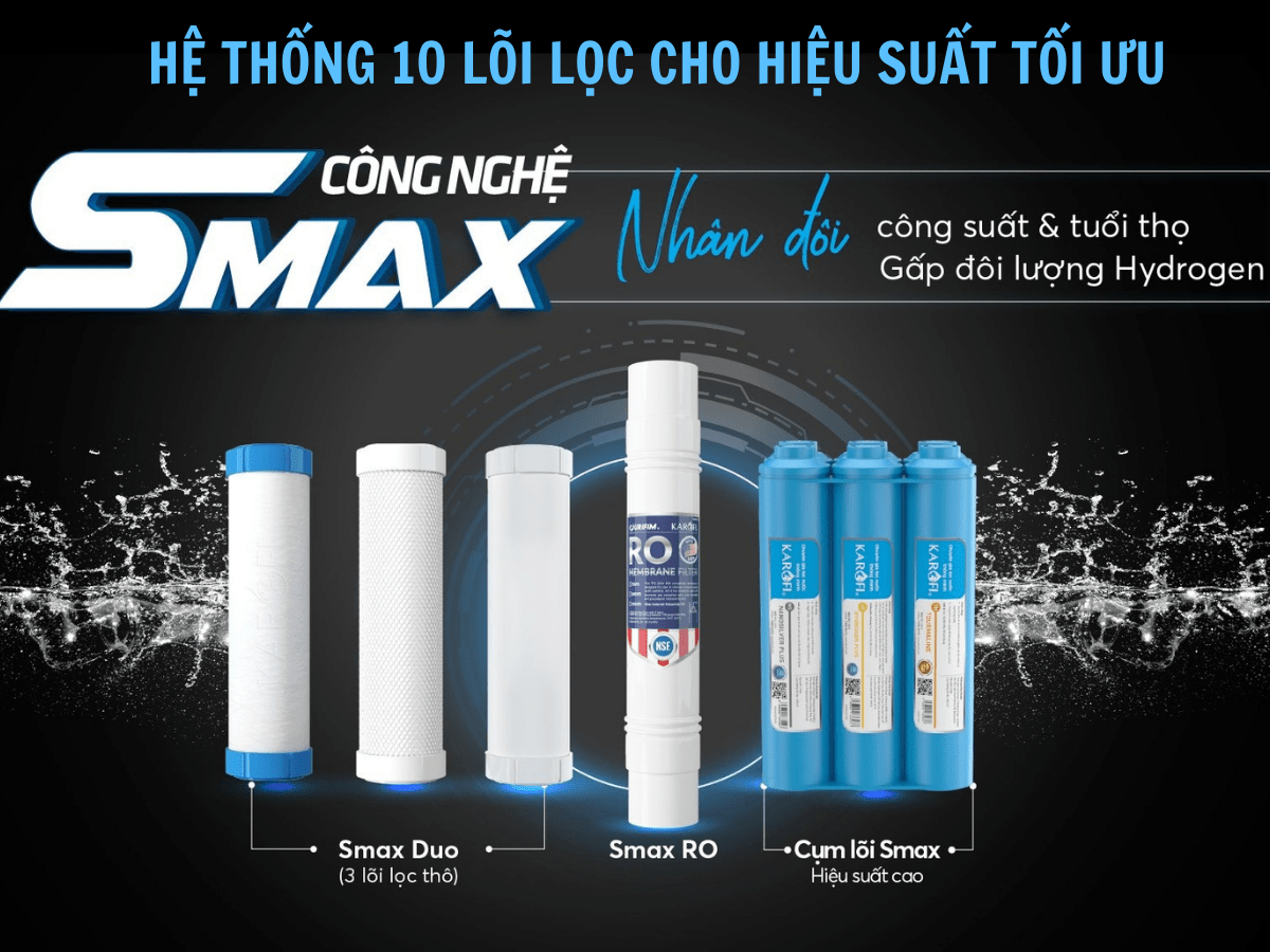 Hệ thống máy lọc nước Karofi KAD-D88 bao gồm 10 chuyên dụng nhằm đảm bảo hiệu suất lọc tối ưu. 10 lõi lọc SMAX mạnh mẽ nhân đôi công suất, gấp đôi tuổi thọ và tiết kiệm đến 71% lượng nước thải. Đặc biệt có lõi lọc Hydrogen Plus bổ sung gấp đôi lượng Hydrogen ngăn ngừa lão hóa, nâng pH tốt cho hệ tiêu hóa.