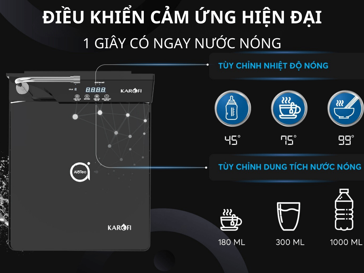 3 chế độ nước được cung cấp qua 1 vòi lấy nước, đặc biệt là điều khiển bằng cảm ứng hiện đại và tiện lợi. Với bảng điều khiển cảm ứng, bạn dễ dàng chọn chế độ nước, tuỳ chỉnh nhiệt độ và dung tích nước nóng theo ý muốn, rất tiện lợi và nhanh chóng.