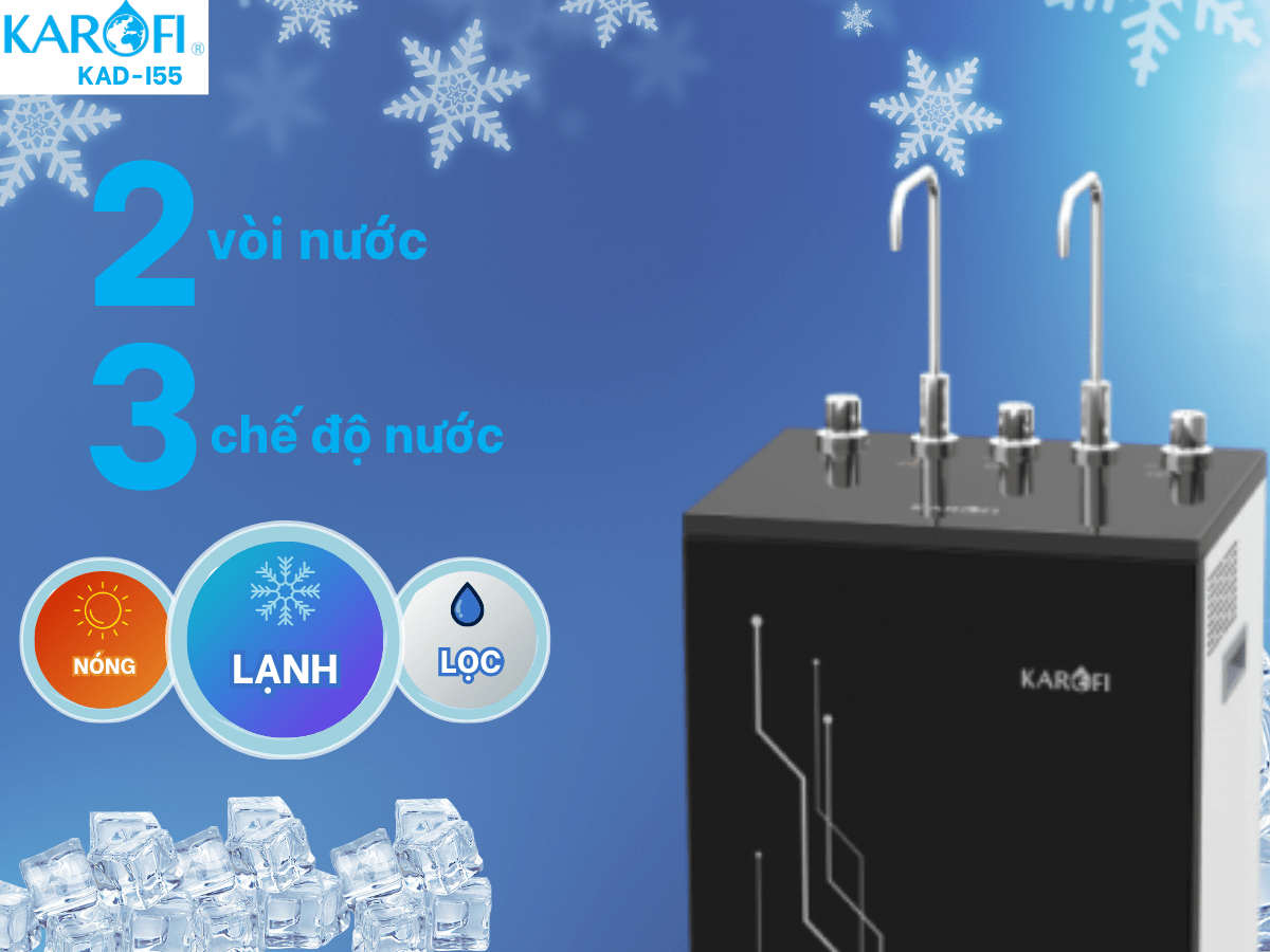 Máy lọc nước Karofi KAD-I55 với thiết kế 2 vòi độc lập, Karofi KAD-I55 được tích hợp 3 chế độ nước nóng – lạnh – tinh khiết, nhờ đó mọi nhu cầu về nước uống của các thành viên trong gia đình đã có ngay chỉ sau thao tác vặn nút. Với tính năng hiện đại này, bạn sẽ có thể thoải mái lựa chọn: