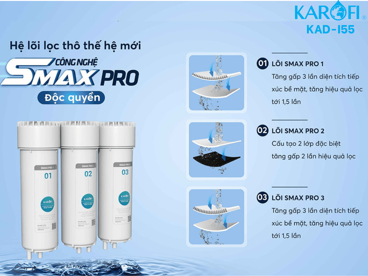 Nhóm lõi lọc thô Smax Pro trong máy lọc nước Karofi KAD-I55 giúp loại bỏ các chất cặn bẩn từ 1 đến 5 micron, loại bỏ hoàn toàn các chất gây mùi trong nguồn nước, đem đến nguồn nước tươi mới, thơm ngọt.