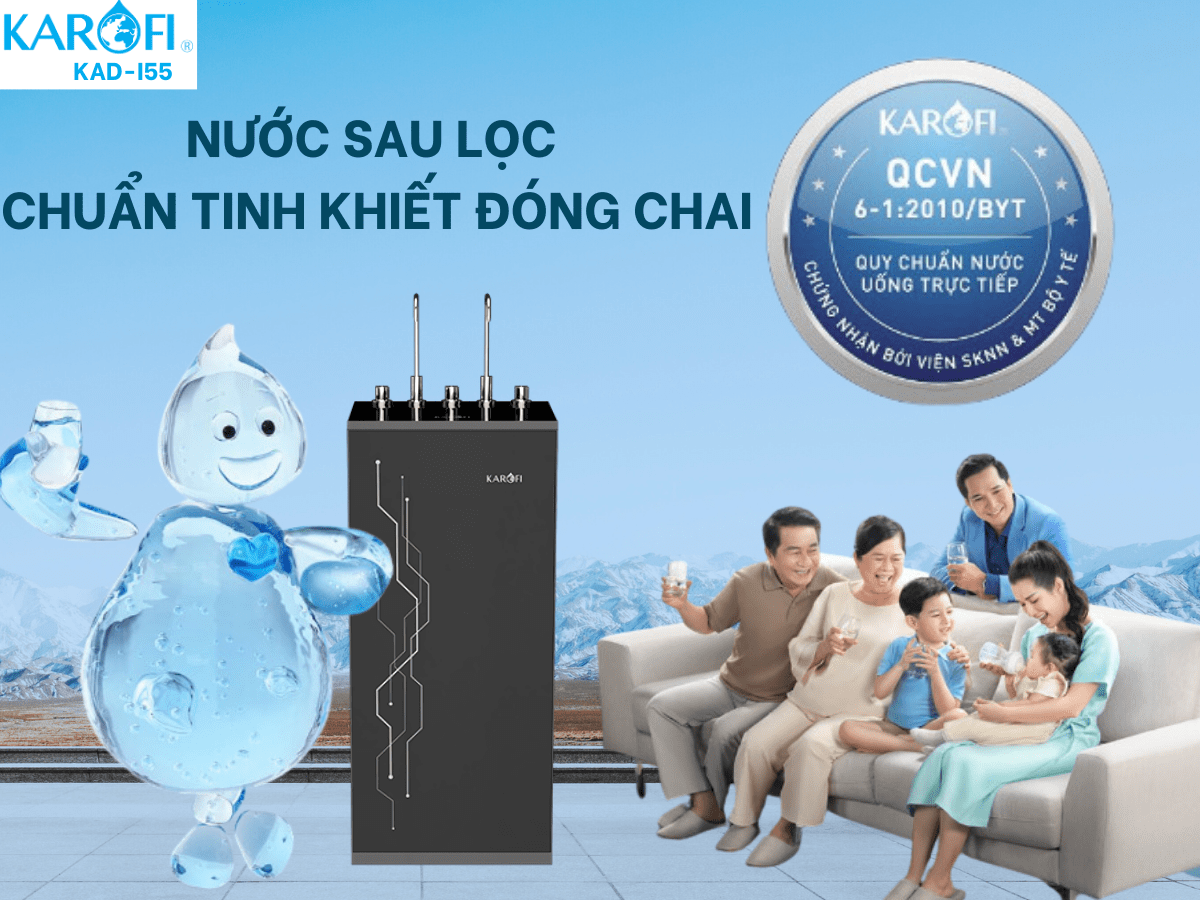 Máy lọc nước Karofi KAD-I55 tạo ra nguồn nước sau lọc tinh khiết, đạt chuẩn nước uống tinh khiết đóng chai QCVN 6-1:2010 BYT do Viện Sức khỏe nghề nghiệp & Môi trường – Bộ Y Tế công nhận.