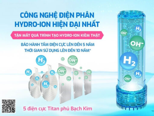 Bộ điện phân Hydro-ion: sử dụng 5 tấm điện cực Titanium phủ Platinum, cấu tạo dạng mắt lưới giúp phân tử nước được chia siêu nhỏ, tăng sức mạnh hiệu suất điện phân.