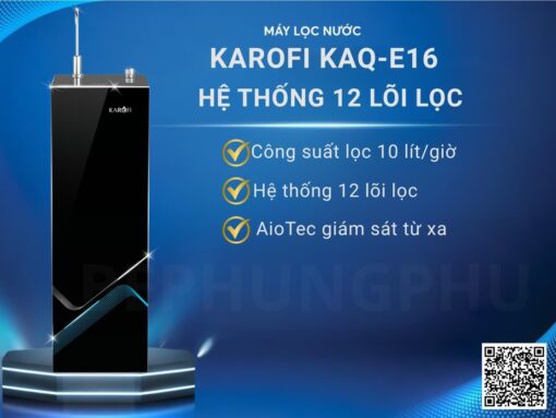 Máy lọc nước Karofi KAQ-E16 thiết kế tủ đứng với mặt kính cường lực tràn viền sang trọng. Công nghệ lọc RO với hệ thống 12 lõi lọc, màng lọc RO Purifim 50 GPD Mỹ cho hiệu suất lọc tối ưu 10 L/h, tuổi thọ lõi đến 3 năm, có thể lọc sạch 99,99% chất độc hại trong nước, đem lại nước sạch tinh khiết đảm bảo an toàn sức khoẻ. Đặc biệt có bổ sung thêm Hydrogen, ion-kiềm và khoáng chất, hỗ trợ chống oxy hoá và tăng cường sức khoẻ.