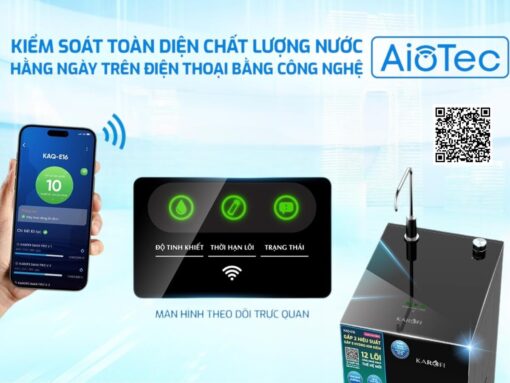 Máy lọc nước Karofi KAQ-E16 còn được tích hợp công nghệ AioTec thông minh. Công nghệ này cho phép giám sát máy lọc nước từ xa trên chính thiết bị di động của bạn. Thông qua công nghệ này, bạn có thể: quản lý tình trạng của máy, xác thực hàng chính hãng, nhận cảnh báo thay lõi tự động, theo dõi độ sạch của nước, gửi yêu cầu bảo hành… Với AioTec, bạn có thể yên tâm giám sát máy từ bất cứ đâu và bất cứ lúc nào.