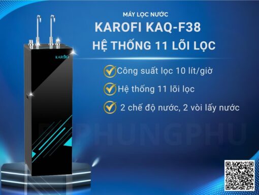 Máy lọc nước Karofi KAQ-F38 thiết kế tủ đứng với mặt kính cường lực tràn viền sang trọng. Công nghệ lọc RO với hệ thống 11 lõi lọc, màng lọc RO Purifim 50 GPD Hàn Quốc cho hiệu suất lọc tối ưu10 L/h, tuổi thọ lõi đến 3 năm, có thể lọc sạch 99,99% chất độc hại trong nước, đem lại nước sạch tinh khiết đảm bảo an toàn sức khoẻ. Đặc biệt có bổ sung thêm ion-kiềm và khoáng chất, hỗ trợ chống oxy hoá và tăng cường sức khoẻ.