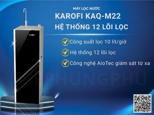 Máy lọc nước Karofi KAQ-M22 thiết kế tủ đứng với mặt kính cường lực tràn viền sang trọng. Công nghệ lọc RO với hệ thống 12 lõi lọc, màng lọc RO Purifim 50 GPD Mỹ cho hiệu suất lọc tối ưu10 L/h, tuổi thọ lõi đến 3 năm, có thể lọc sạch 99,99% chất độc hại trong nước, đem lại nước sạch tinh khiết đảm bảo an toàn sức khoẻ. Đặc biệt có bổ sung thêm Hydrogen, ion-kiềm và khoáng chất, hỗ trợ chống oxy hoá và tăng cường sức khoẻ.