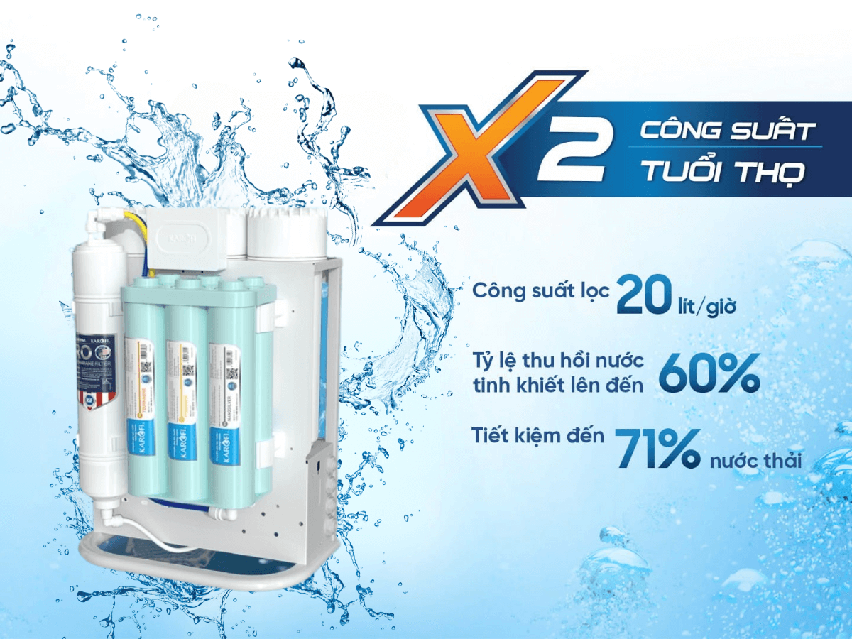 Công nghệ lọc RO cũng cho hiệu suất lọc cao với khả năng lọc 20 lít nước mỗi giờ, giảm nước thải, tăng tỷ lệ thu hồi nước tinh khiết đến 60%. Đồng thời lõi RO cũng có tuổi thọ cao, tối đa đến 36 tháng giúp bạn tiết kiệm được nhiều chi phí cho việc thay lõi.