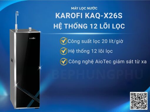 Máy lọc nước Karofi KAQ-X26S thiết kế tủ đứng với mặt kính cường lực tràn viền sang trọng. Công nghệ lọc RO với hệ thống 12 lõi lọc, màng lọc RO Purifim 100 GPD Mỹ cho hiệu suất lọc vượt trội 20 L/h, tuổi thọ lõi đến 3 năm, có thể lọc sạch 99,99% chất độc hại trong nước, đem lại nước sạch tinh khiết đảm bảo an toàn sức khoẻ. Đặc biệt có bổ sung thêm Hydrogen, ion-kiềm và khoáng chất, hỗ trợ chống oxy hoá và tăng cường sức khoẻ.