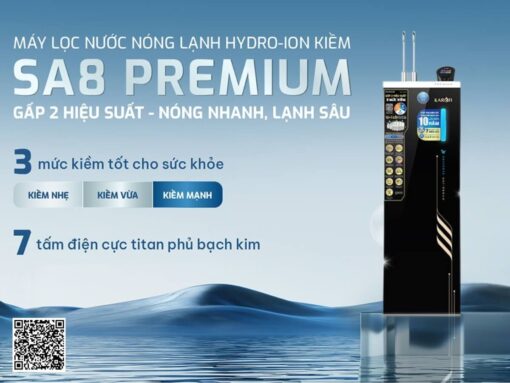 Máy lọc nước Karofi SA8 Premium được trang bị 2 công nghệ lọc: lọc RO kết hợp điện phân tạo nước ion kiềm tốt cho sức khỏe. Công nghệ lọc RO với hệ thống 12 lõi lọc, màng lọc RO Purifim 100 GPD Mỹ cho hiệu suất lọc vượt trội 20 L/h, tuổi thọ lõi đến 3 năm, có thể lọc sạch 99,99% chất độc hại trong nước, đem lại nước sạch tinh khiết đảm bảo an toàn sức khoẻ. Công nghệ lọc điện phân với 7 tấm điện cực tạo nước giàu Hydrogen, ion-kiềm và khoáng chất, hỗ trợ chống oxy hoá và tăng cường sức khoẻ. Máy cung cấp đến 9 chế độ nước đáp ứng đầy đủ nhu cầu về nước sạch cho cả gia đình.