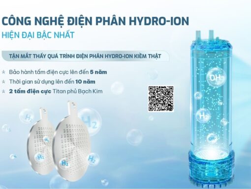 Bộ điện phân Hydro-ion: sử dụng 7 tấm điện cực Titanium phủ Platinum, cấu tạo dạng mắt lưới giúp phân tử nước được chia siêu nhỏ, tăng sức mạnh hiệu suất điện phân.