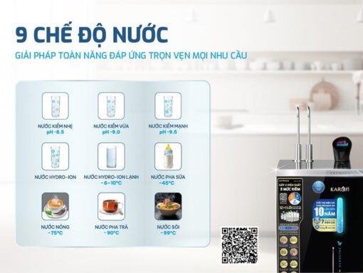 • 9 chế độ nước: nóng – lạnh – nguội – nước Hydro-ion – nước kiềm