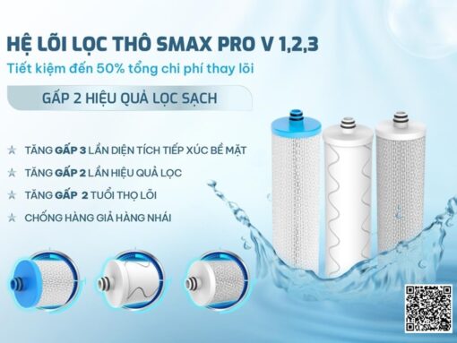 – Lõi SMAX PRO V3 – Cấu tạo từ lõi xếp giấy 5 lớp cấu trúc rẽ quạt thông minh, vật liệu vải y tế kháng khuẩn chuẩn dùng trong y tế. Lõi lọc thô số 3 loại bỏ các chất như rong rêu, cặn bẩn, bụi cát, chất rắn… có kích thước lớn hơn 1 micron.