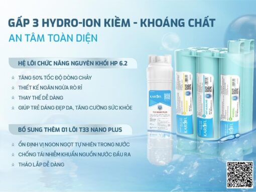 – Lõi Hydro-ion kiềm: Bổ sung gấp 3 Hydrogen, tăng cường khoáng chất, nâng cao pH, hỗ trợ trung hòa axit dư thừa, loại bỏ gốc tự do có hại cho cơ thể