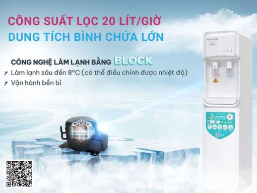- Nước lạnh có nhiệt độ từ 8 – 10°C, được làm lạnh với công suất 90W, đặc biệt là công nghệ làm lạnh Block giúp làm lạnh sâu, tạo nước mát lạnh để giải khát tức thì trong những ngày nóng hoặc khi cần nước lạnh để pha chế đồ uống khác.