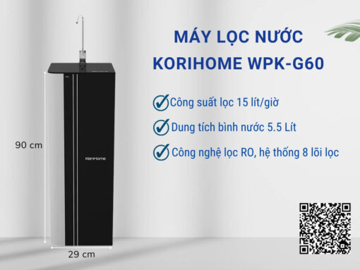 Máy lọc nước Korihome WPK-G60 trang bị công nghệ lọc RO với hệ thống 8 lõi lọc tiên tiến, giúp lọc sạch cặn bẩn, vi khuẩn, mang lại nước sạch tinh khiết có thể uống trực tiếp mà không cần đun nấu lại. Công suất lọc 15 lít/giờ cùng bình áp chứa nước 5.5 lít đảm bảo cung cấp đủ nguồn nước sạch sử dụng cho cả gia đình.