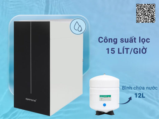 Công suất lọc 15 lít/giờ, bình chứa nước 12 lít