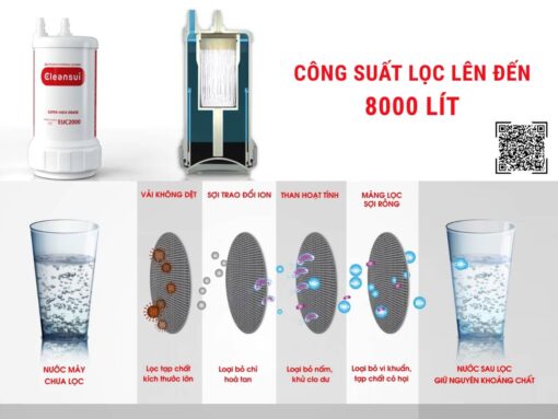 Máy lọc nước Mitsubishi Cleansui EU201 sử dụng lõi lọc nước có công suất lọc lên đến 8000 lít, có thể dùng trong 12 tháng (20 lít nước/ngày) liên tục.
