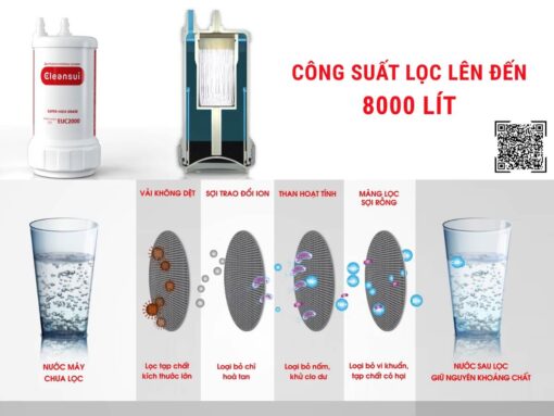 Máy lọc nước Mitsubishi Cleansui EU202 sử dụng lõi lọc nước có công suất lọc lên đến 8000 lít, có thể dùng trong 12 tháng (20 lít nước/ngày) liên tục.