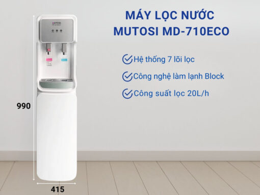 Máy lọc nước Mutosi MD-710ECO thiết kế tủ đứng sang trọng, 2 chế độ nước nóng – lạnh đáp ứng tốt nhu cầu nước sạch cho gia đình. Công nghệ lọc RO với hệ thống 7 lõi lọc, cho hiệu suất lọc vượt trội 20 L/h, tuổi thọ lõi đến 3 năm, có thể lọc sạch 99,99% chất độc hại trong nước, đem lại nước sạch tinh khiết đảm bảo an toàn sức khoẻ. Đặc biệt có bổ sung thêm Hydrogen, ion-kiềm và khoáng chất, hỗ trợ chống oxy hoá và tăng cường sức khoẻ.