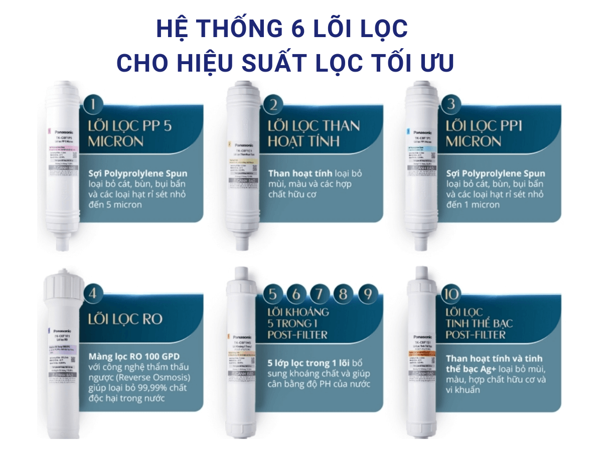 Công nghệ lọc RO cùng hệ thống 6 lõi lọc chuyên dụng trên máy lọc nước Panasonic TK-CA811K-VN được thiết kế để đem đến hiệu suất lọc tối ưu, cho công suất lọc lớn và đảm bảo lọc sạch đến 99,99% chất bẩn, vi khuẩn, chất độc hại trong nước. Đem đến nguồn nước lọc hoàn toàn sạch sẽ, tinh khiết và an toàn.