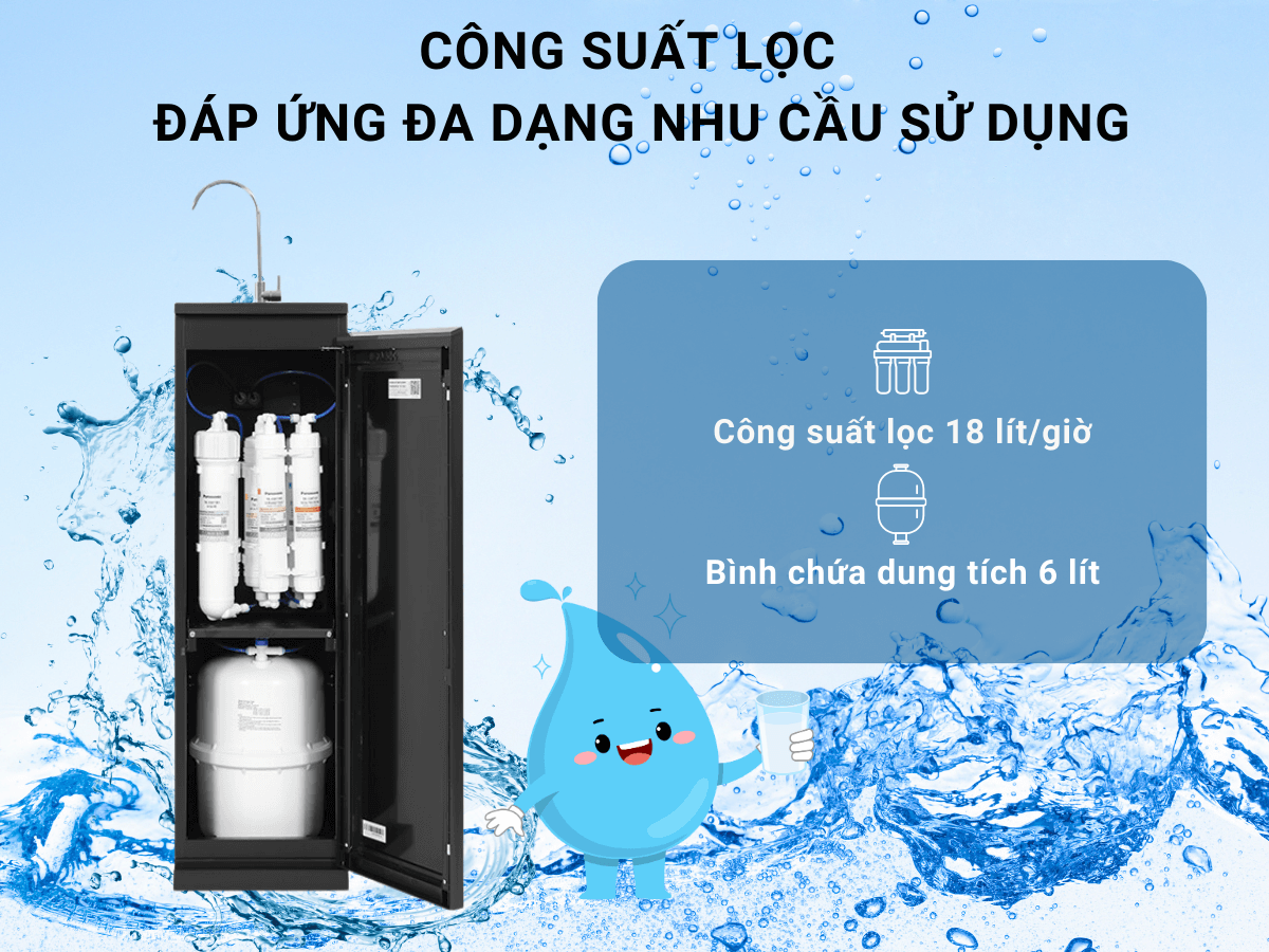 Công suất lọc 18 lít/giờ, dung tích bình chứa lớn