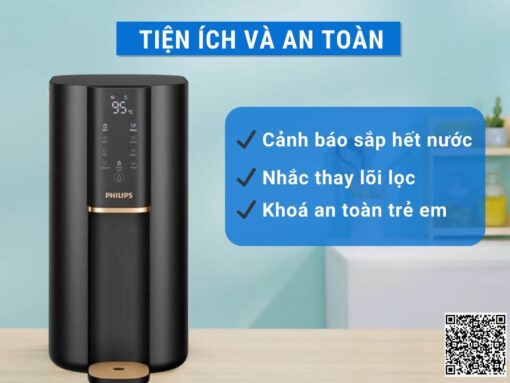 Máy lọc nước Philips ADD6901HBK01/74 thiết kế để bàn nhỏ gọn, điều khiển cảm ứng hiện đại, tăng thêm thẩm mỹ cho không gian. Công nghệ lọc RO với lõi lọc 4in1 lọc sạch 99,9% cặn bẩn, vi khuẩn, vi rút trong nước, cùng đèn LED UV tiệt trùng bình chứa nước, tạo nước sạch tinh khiết, an toàn để uống trực tiếp. Máy cung cấp nước thường, nước ấm và nước nóng tiện dụng, với bình chứa nước thô 4 lít dễ tháo lắp và thêm nước. Bạn có thể tuỳ chỉnh 4 mức nhiệt độ nước và 4 mức dung tích nước theo nhu cầu. Ngoài ra còn có chế độ khoá trẻ em, cảnh báo bình hết nước và thay bộ lọc tự động tăng thêm tiện dụng cho người dùng.