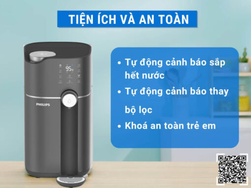 Máy lọc nước Philips ADD6910/90 thiết kế để bàn nhỏ gọn, điều khiển cảm ứng hiện đại, tăng thêm thẩm mỹ cho không gian. Công nghệ lọc RO với lõi lọc 5in1 lọc sạch 99,9% cặn bẩn, vi khuẩn, vi rút trong nước, cùng đèn LED UV tiệt trùng bình chứa nước, tạo nước sạch tinh khiết, an toàn để uống trực tiếp. Máy cung cấp nước thường, nước ấm và nước nóng tiện dụng, với bình chứa nước 4 lít dễ tháo lắp và thêm nước. Bạn có thể tuỳ chỉnh 4 mức nhiệt độ nước và 4 mức dung tích nước theo nhu cầu. Ngoài ra còn có chế độ khoá trẻ em, cảnh báo bình hết nước và thay bộ lọc tự động tăng thêm tiện dụng cho người dùng.