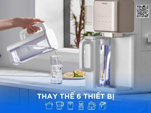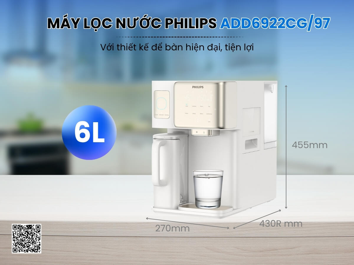Máy lọc nước Philips ADD6922CG/97 thiết kế để bàn sang trọng, tích hợp bình chứa nước dung tích lớn 6 lít, đáp ứng tốt nhu cầu sử dụng cho gia đình. Sản phẩm trang bị hệ thống lọc RO Aquaporin Inside 6 giai đoạn tiên tiến, loại bỏ 99,9% vi khuẩn và tạp chất đến kích thước 0,0001 micron. Máy cho phép chọn 6 mức nhiệt độ nước từ 5°C đến 100°C, làm đá nhanh chỉ sau 8 phút và có đèn UV diệt khuẩn giúp nước luôn tinh khiết.