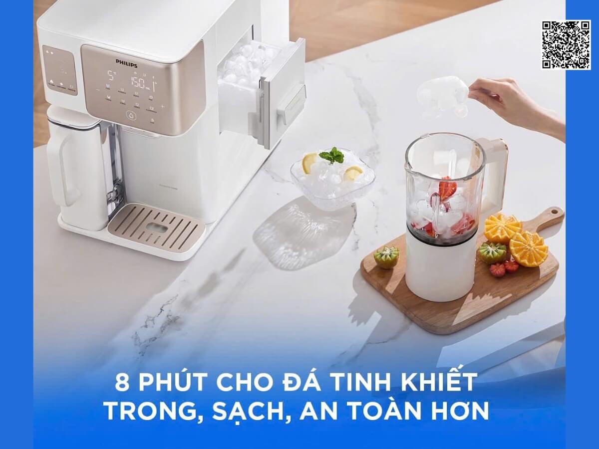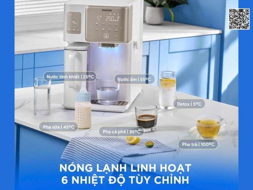 Máy lọc nước Philips ADD6922CG/97là máy lọc nước đa năng tích hợp cùng lúc lọc RO, làm nóng, làm lạnh và làm đá. Người dùng có thể chọn 6 mức nhiệt độ từ 5°C đến 100°C tùy theo nhu cầu: pha sữa, cà phê, trà hay dùng nước mát lạnh giải khát. Nhờ hệ thống làm lạnh bằng máy nén hiệu suất cao, nước được làm mát sâu chỉ còn 5°C, đồng thời mỗi 8 phút máy có thể tạo ra một mẻ đá viên mới, tiện lợi và nhanh chóng.