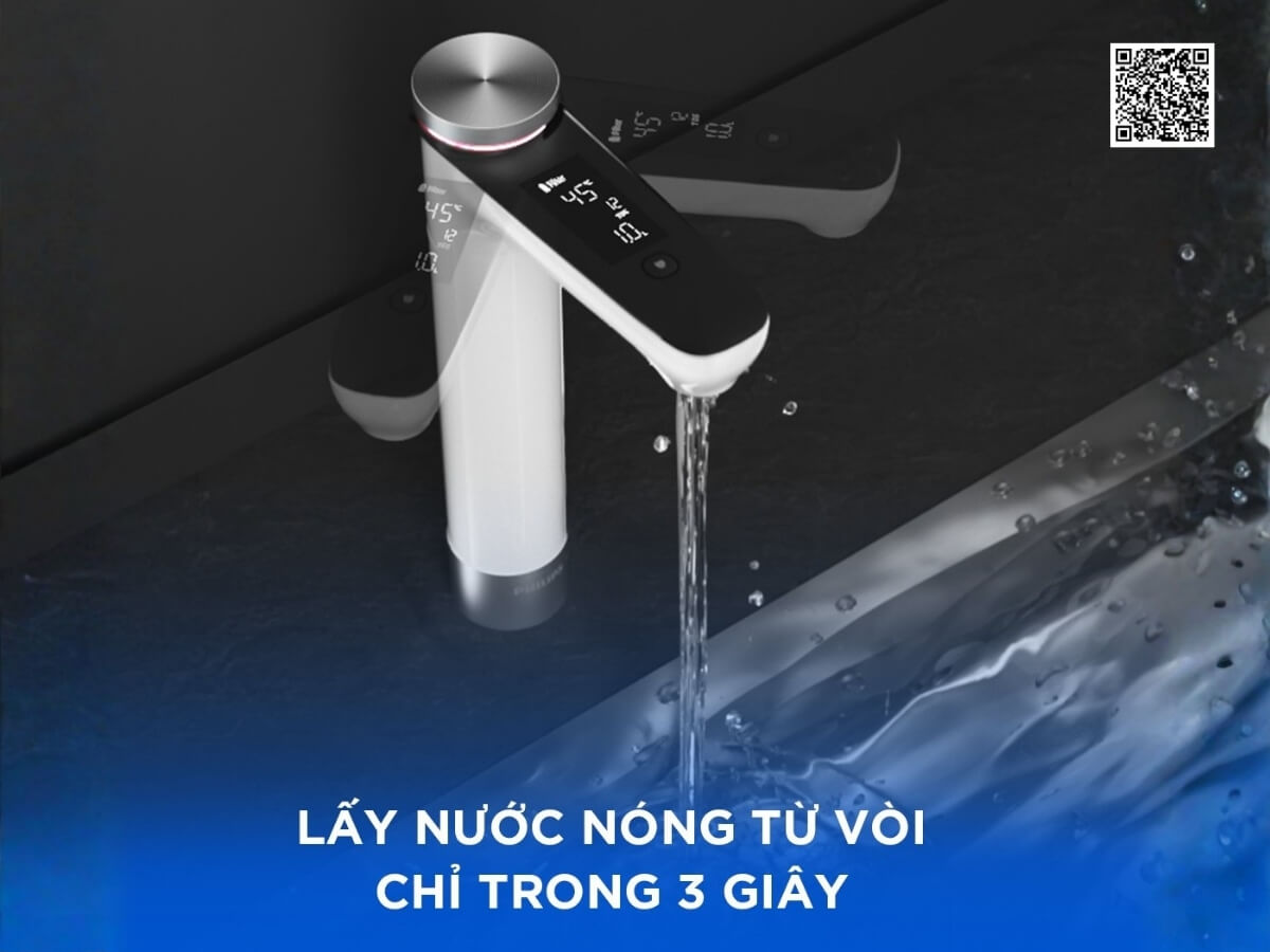 Bên cạnh đó, vòi tích hợp núm vặn chọn nhiệt độ nước tiện lợi, thao tác mượt mà và chính xác. Nút hiển thị thể tích nước cho phép lựa chọn dung tích nước nóng 0.2L, 0.5L hoặc 1.0L, đáp ứng linh hoạt nhu cầu sử dụng hằng ngày. Ngoài ra, máy còn hỗ trợ thông báo thay lõi lọc và chế độ sục rửa tự động, mang đến trải nghiệm thông minh và tiện nghi toàn diện.