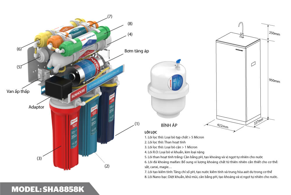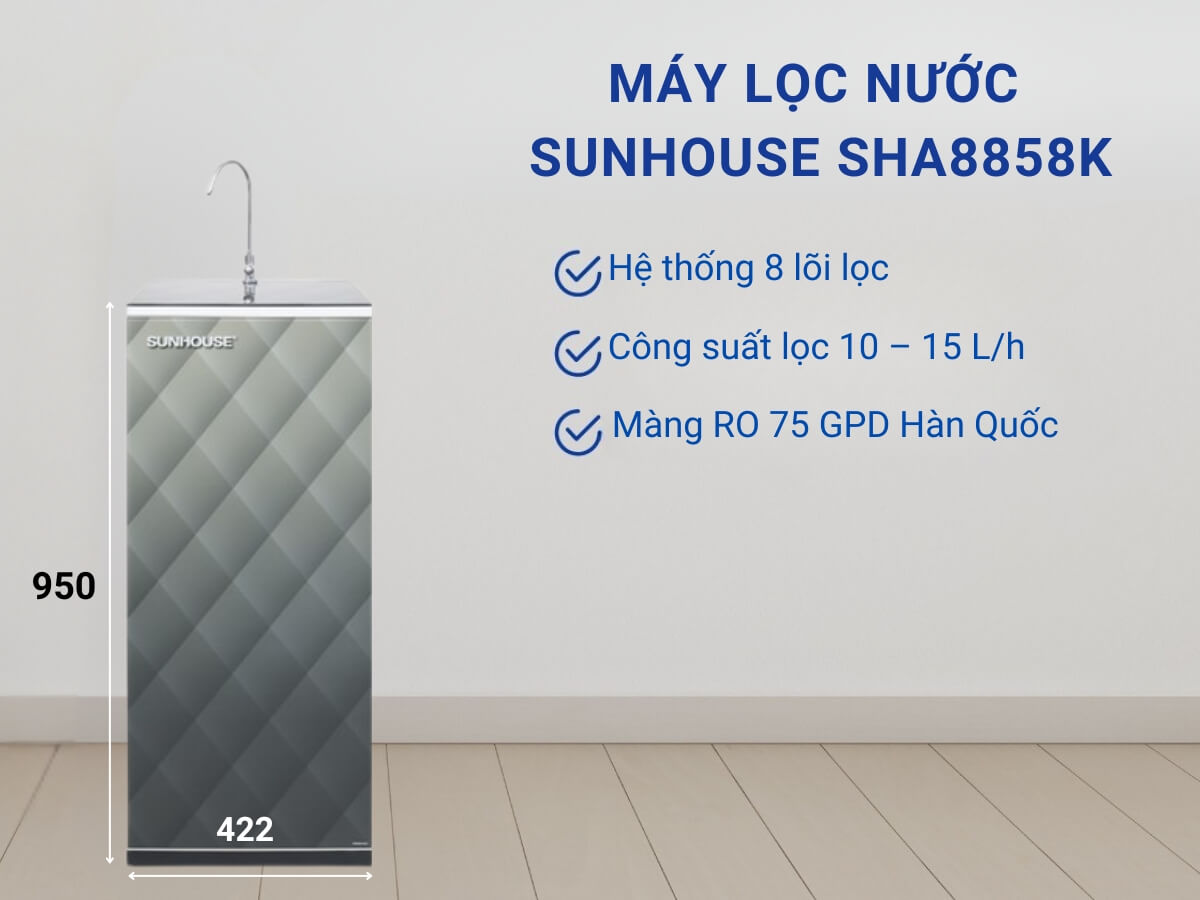 Máy lọc nước Sunhouse SHA8858K thiết kế tủ đứng sang trọng, công nghệ lọc RO với màng lọc RO 75 GPD Hàn Quốc cho công suất lọc 10 – 15 L/h, đáp ứng đầy đủ nhu cầu nước sạch cho gia đình. Hệ thống 8 lõi lọc, mang đến nguồn nước lọc tinh khiết, đảm bảo an toàn sức khoẻ, có thể uống trực tiếp mà không cần đun nấu lại.