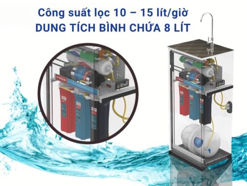 Công suất lọc 10 – 15 lít/giờ, dung tích bình chứa 8 lít