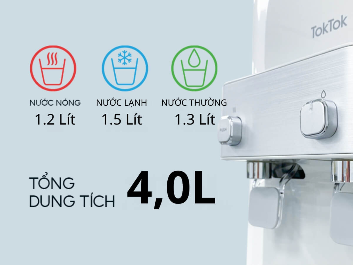 Máy lọc nước Toktok-071 được trang bị tổng dung tích 4,0 lít – mức dung tích tối ưu cho một chiếc máy lọc nước để bàn, giúp lưu trữ và cung cấp nguồn nước sạch liên tục đủ dùng cho gia đình hay văn phòng nhỏ. Bình chứa làm bằng thép không gỉ, kháng khuẩn mạnh mẽ và dễ vệ sinh. Cụ thể: